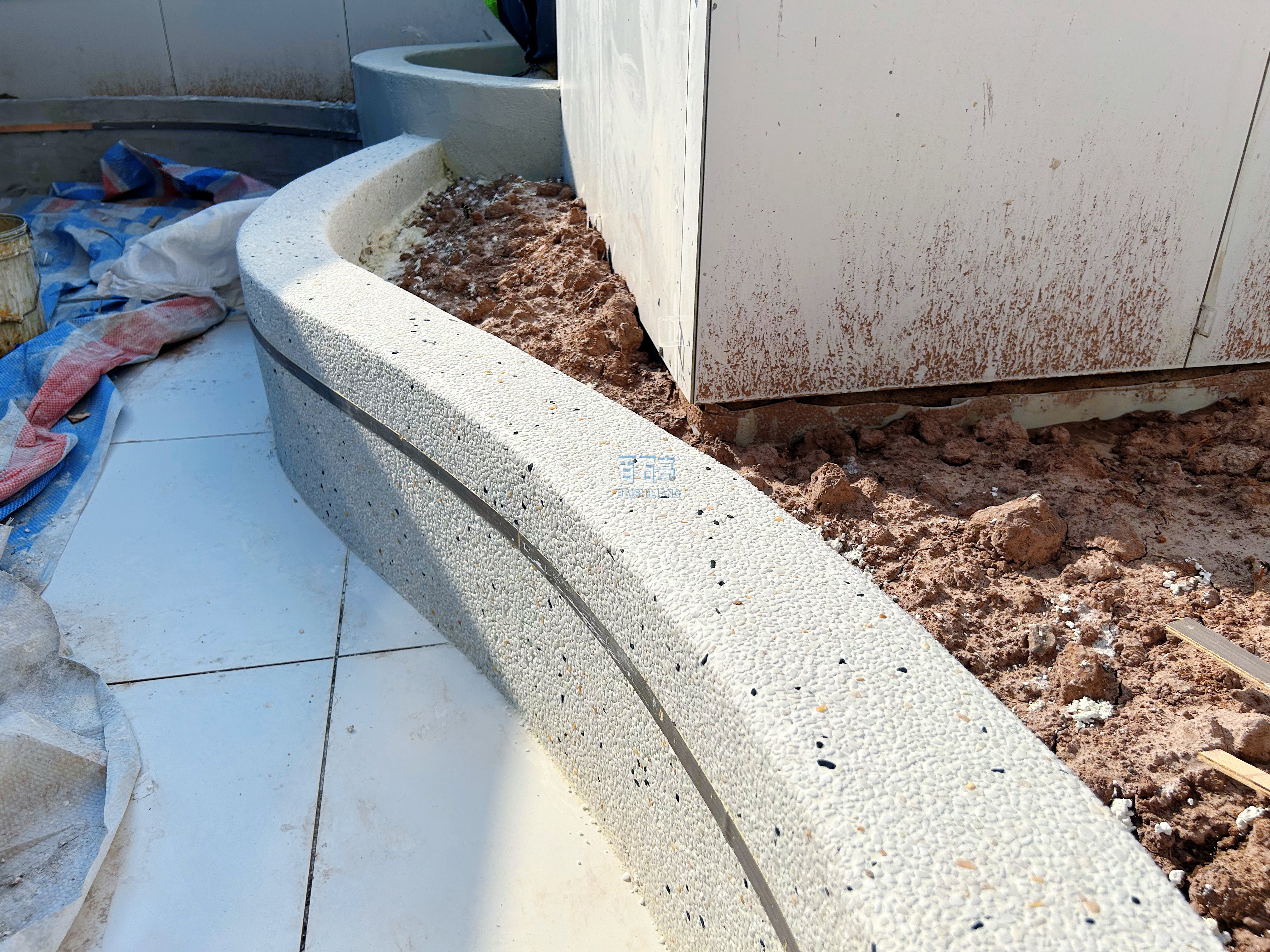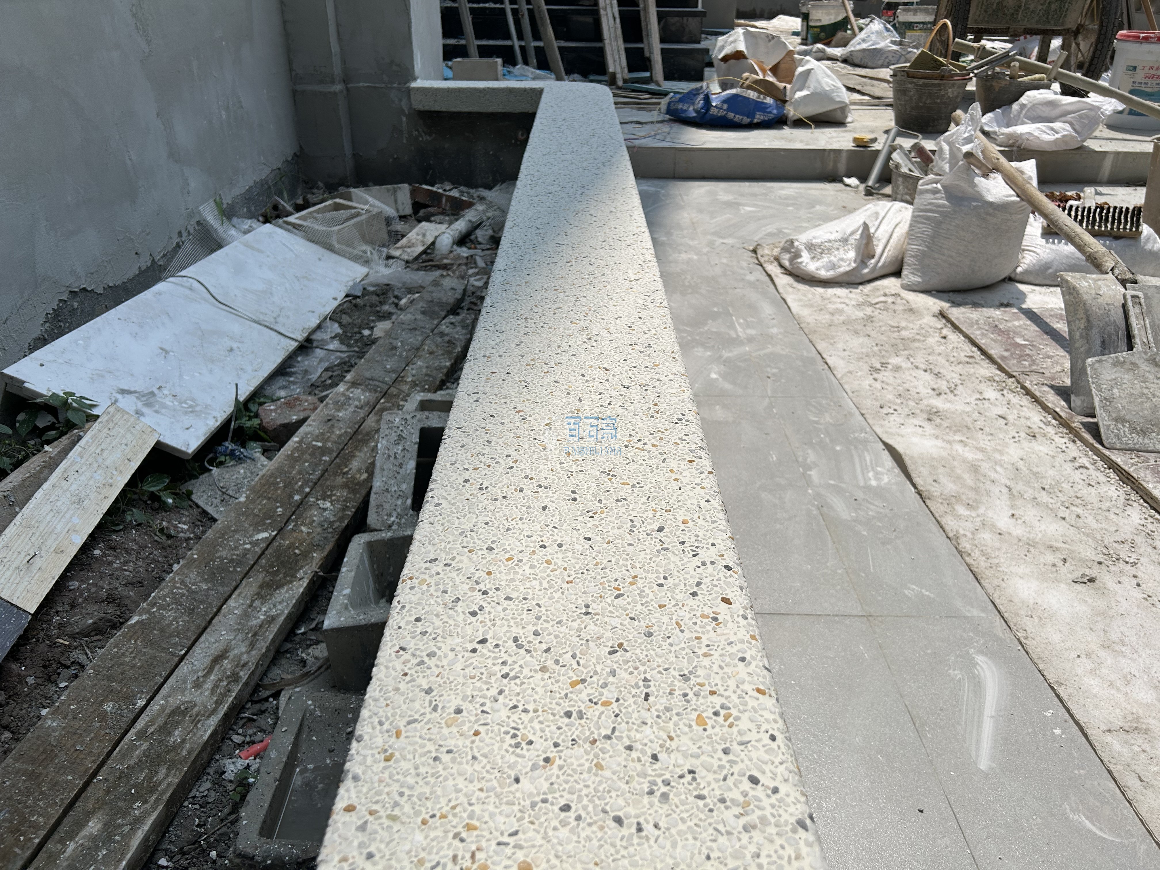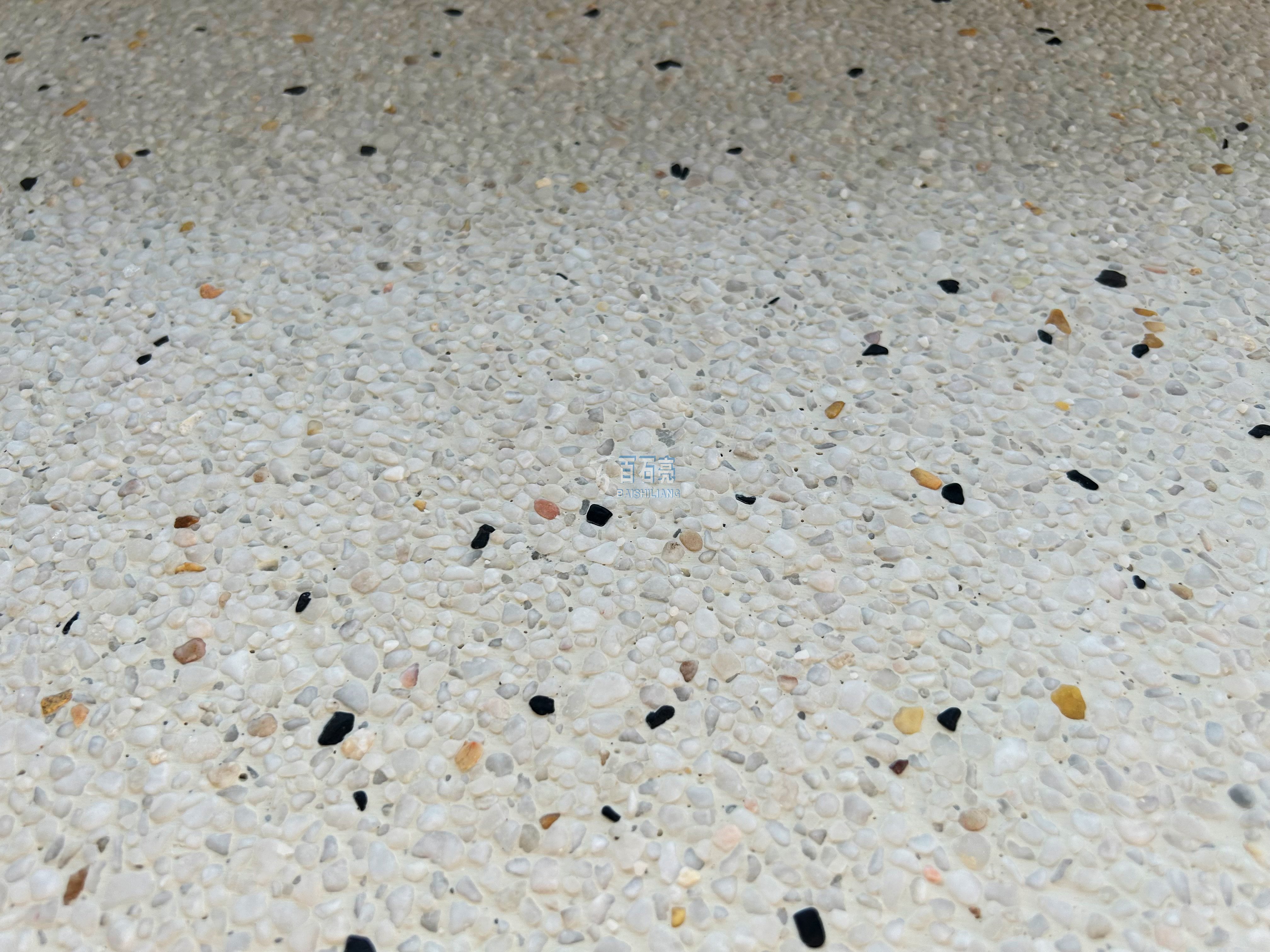 今天為大家介紹一處屋頂花園的水洗石案例。客戶選用的白色基底加3-5的白色骨料與少量的黑色、黃色骨料配比而成的水洗石。