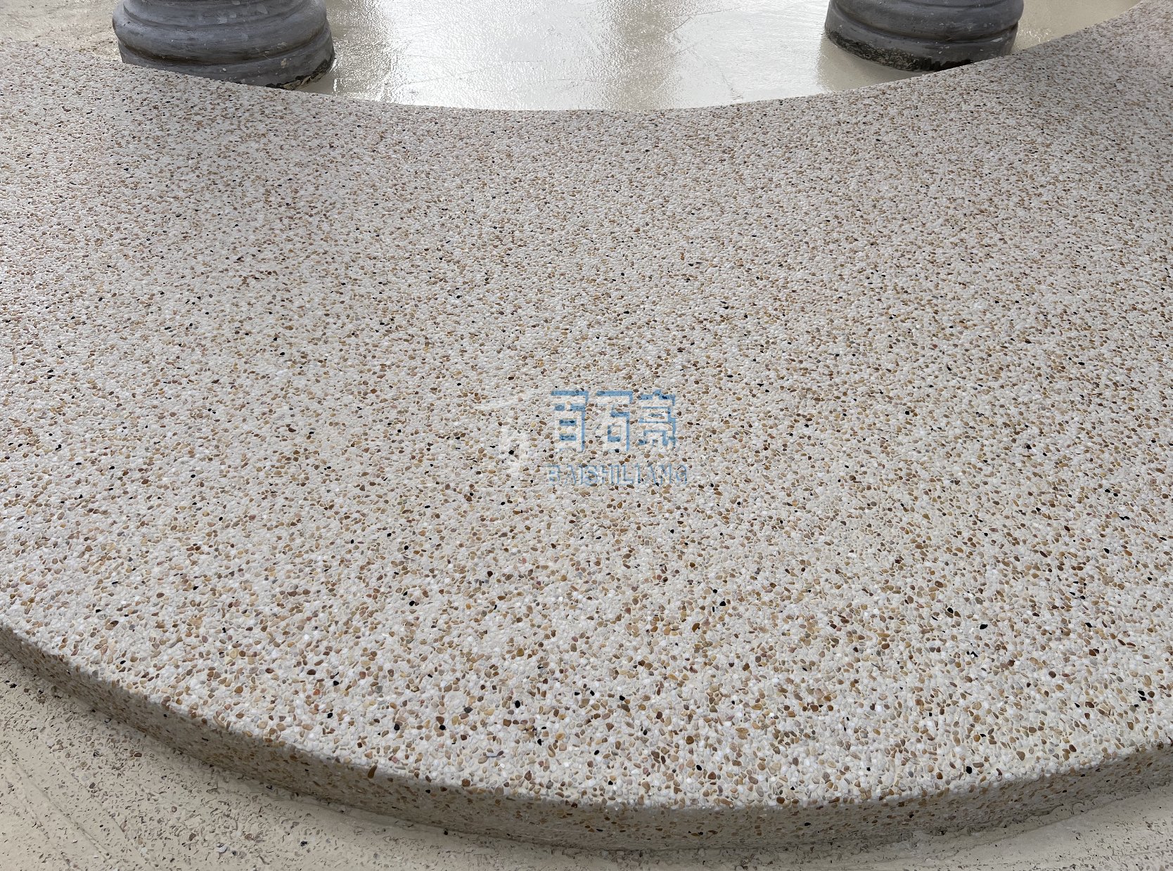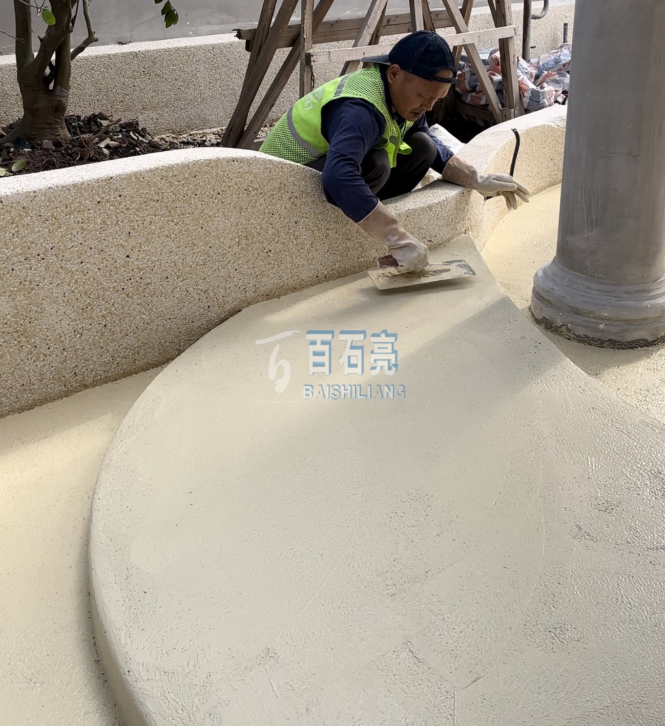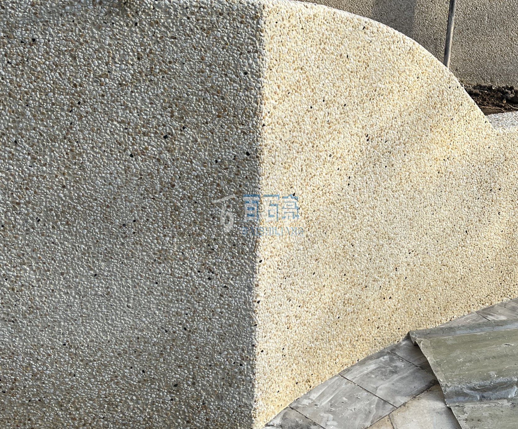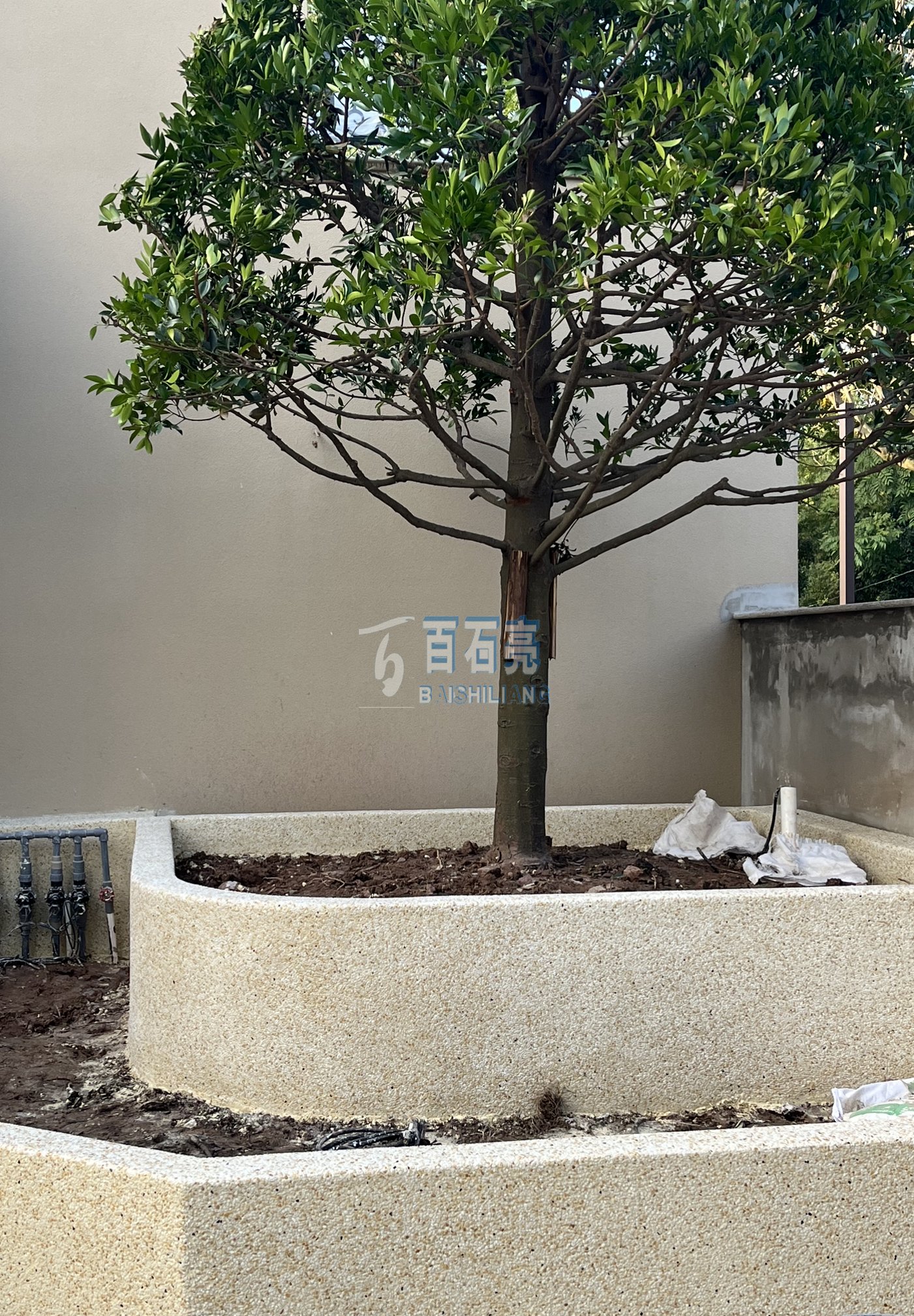 水洗石主要的施工范圍是一些花池、墻面、踢腳線、還有地面、臺(tái)面。做了一些不規(guī)則的設(shè)計(jì),有弧形,還有一些直線看起來線條豐富,很有層次感。