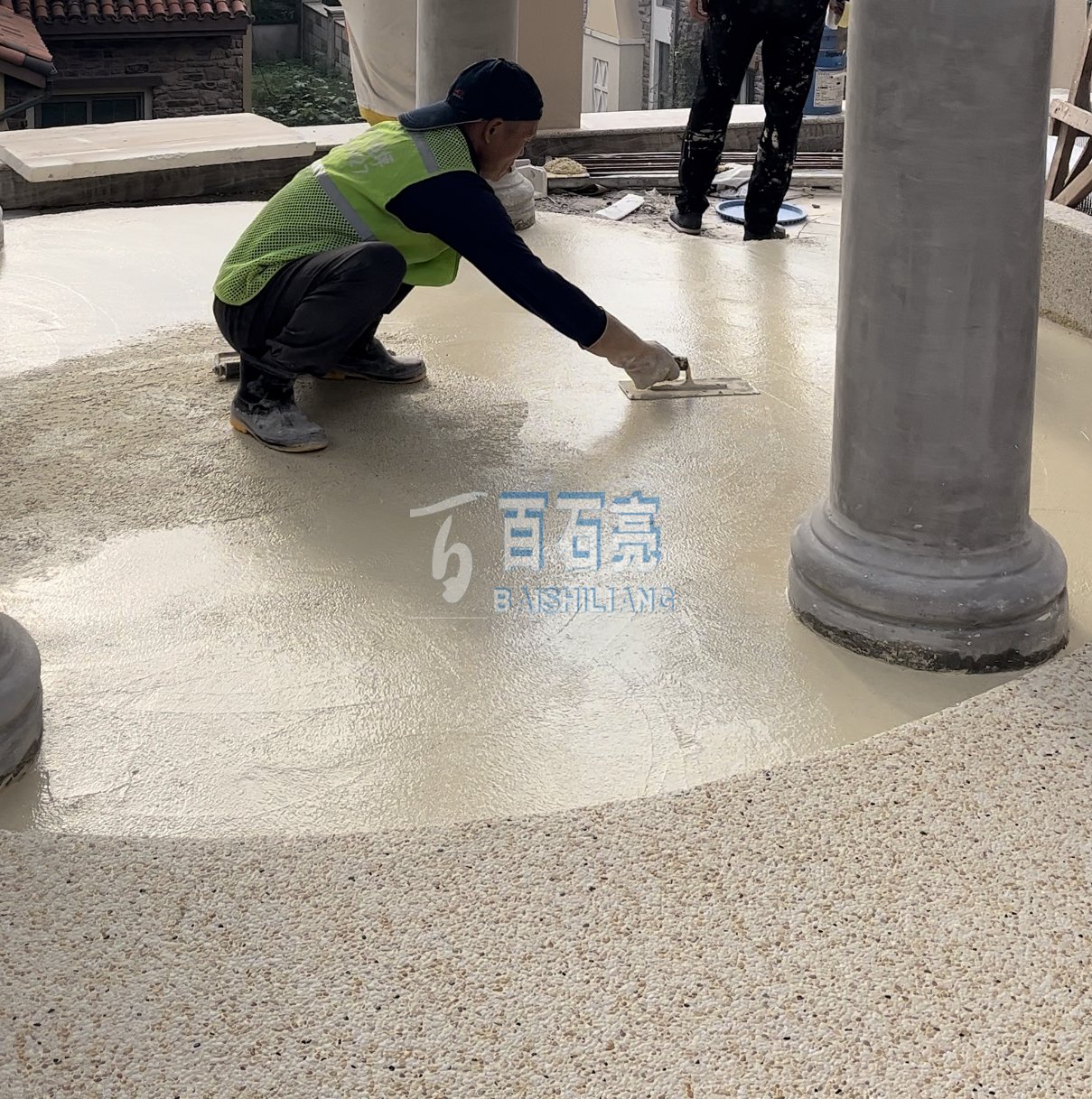 - 渝北壹江郡花園水磨石 這是一款由白色水泥加白色骨料 均勻混合而成的水磨石 用在花園地面 光滑又平整 清新自然 攤鋪 將混合均勻的水磨石材料攤鋪在地面上厚度1.5-2公分。 使用靠尺...