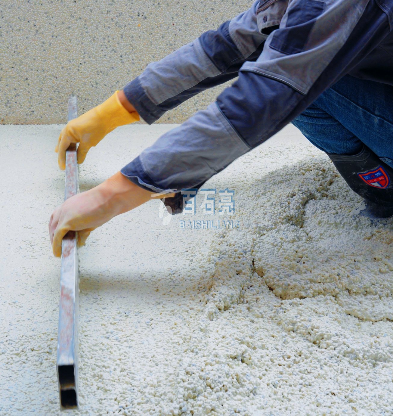 將配比好的水泥與骨料加水攪拌均勻,然后攤鋪在墻面和地面上,用靠尺一邊找平,一邊攤鋪,讓地面的厚度一致。
