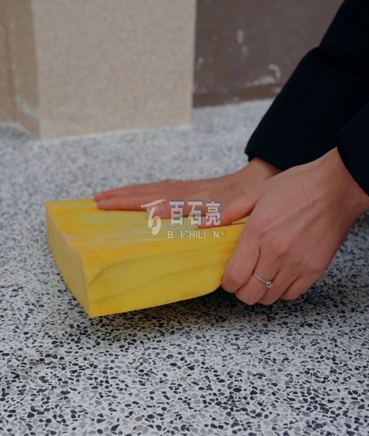 攤鋪完成后的水洗石需要等待3-4個小時,在表面水泥還沒有完全干透的情況下,就使用海綿將表面的水泥漿清洗干凈,直到海綿上沒有殘留的水泥漿。
