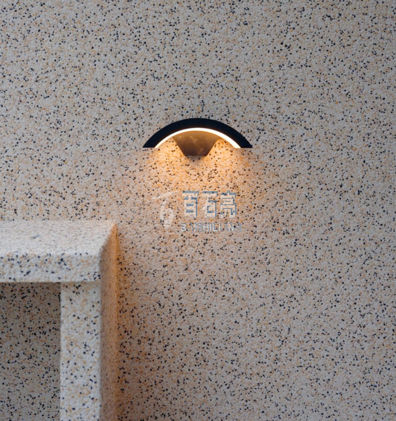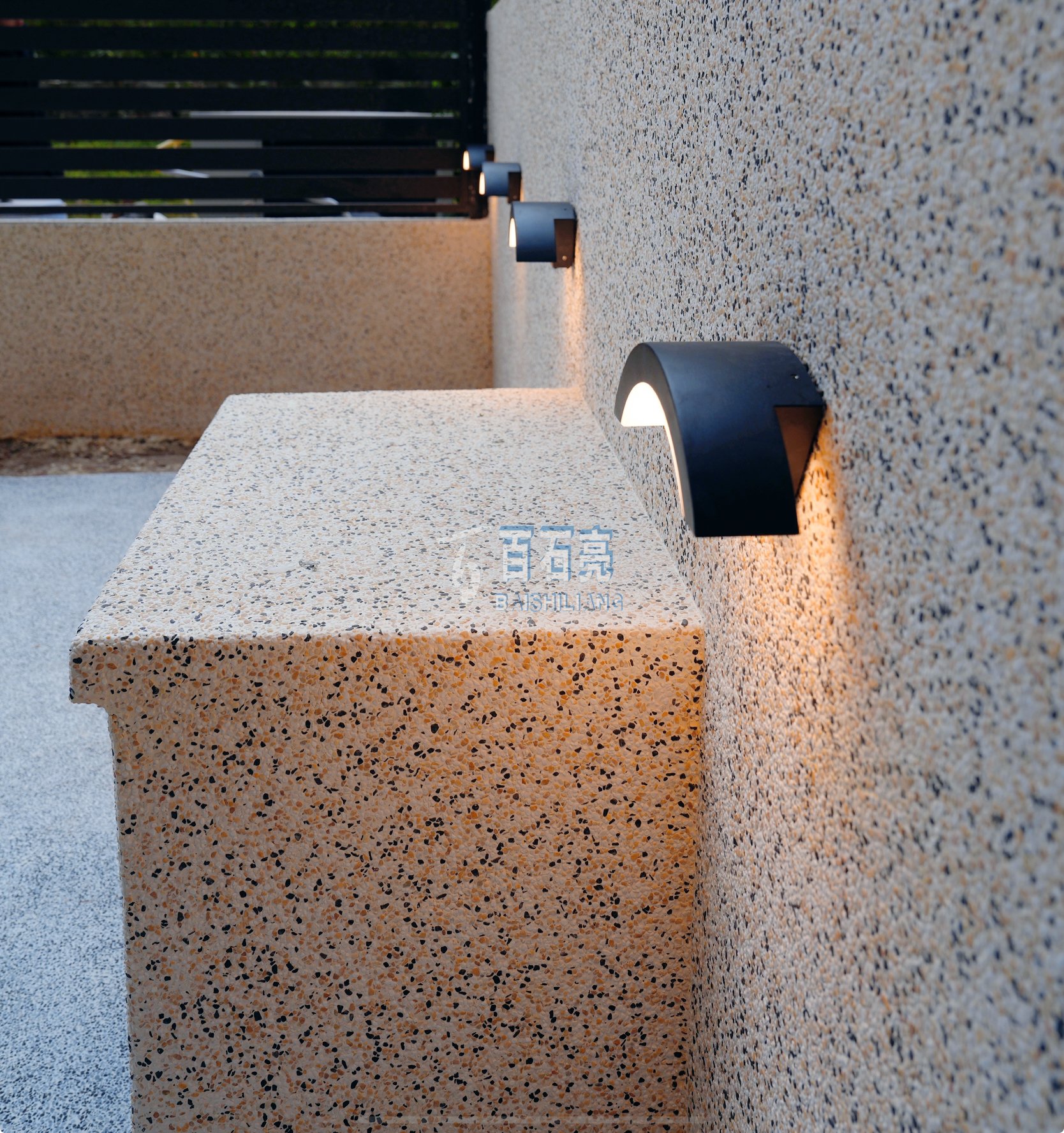 成品完成后的水洗石,黃色系的墻面搭配上暖色調(diào)的燈光,花園再種上綠植,整個花園的氛圍感就有了。