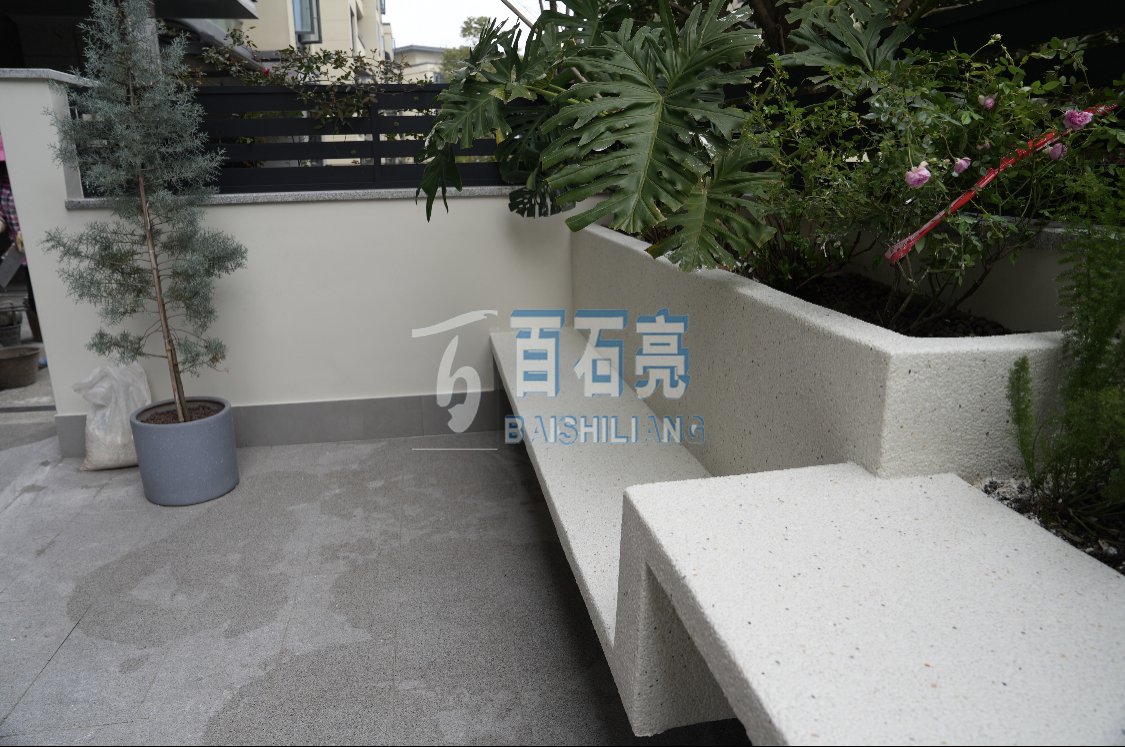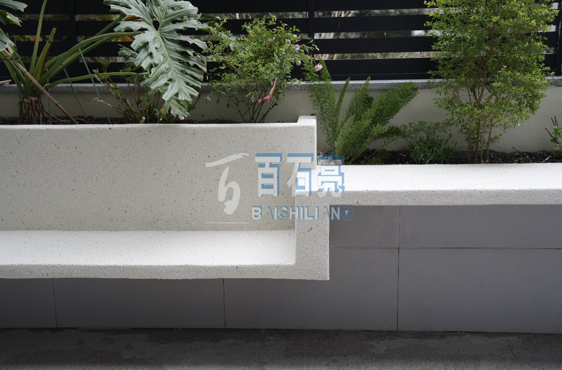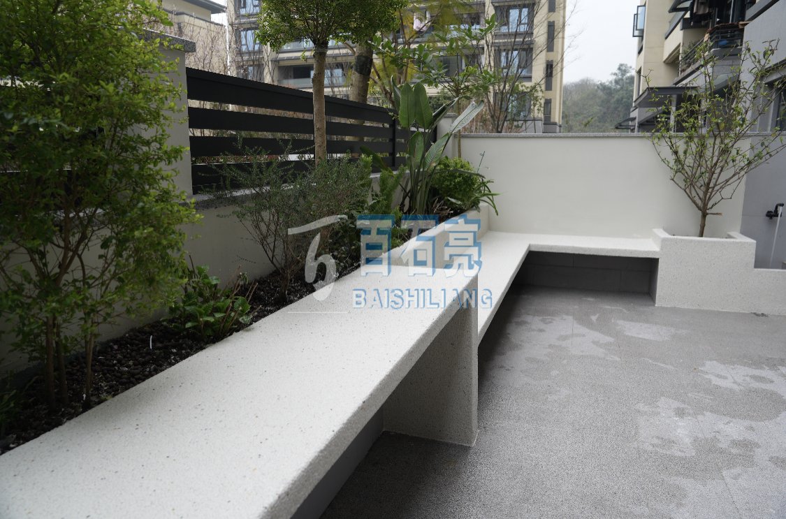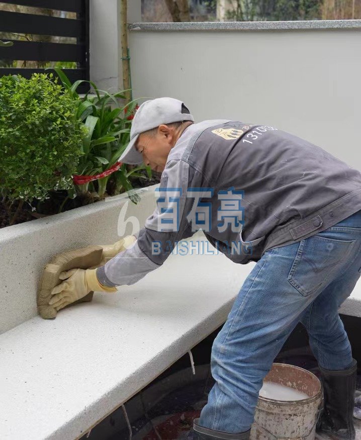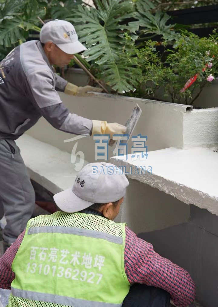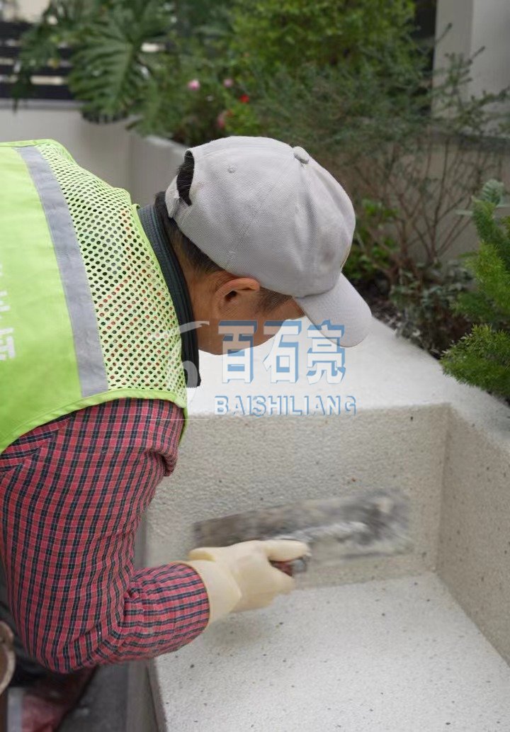 將混合均勻的水洗石骨料與水泥,攤鋪在平面和立面上,厚度大約在1-1.5公分左右。施工的范圍就是花池,坐凳,很多線條感。