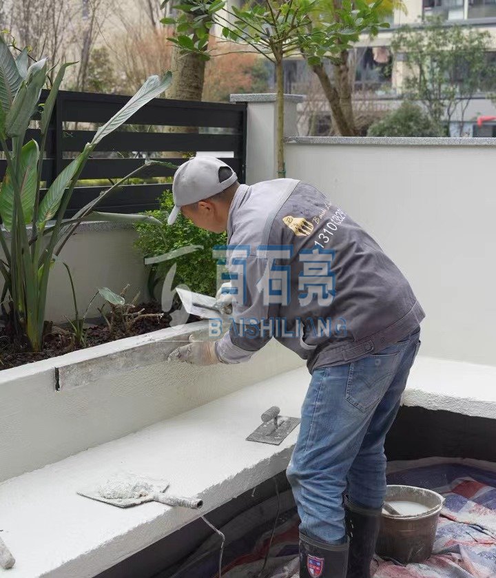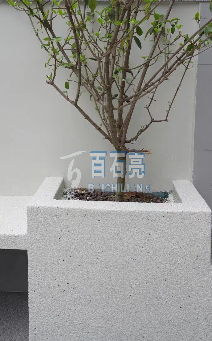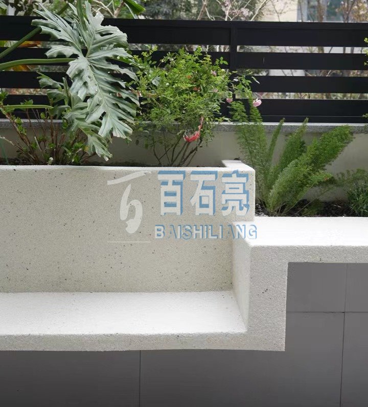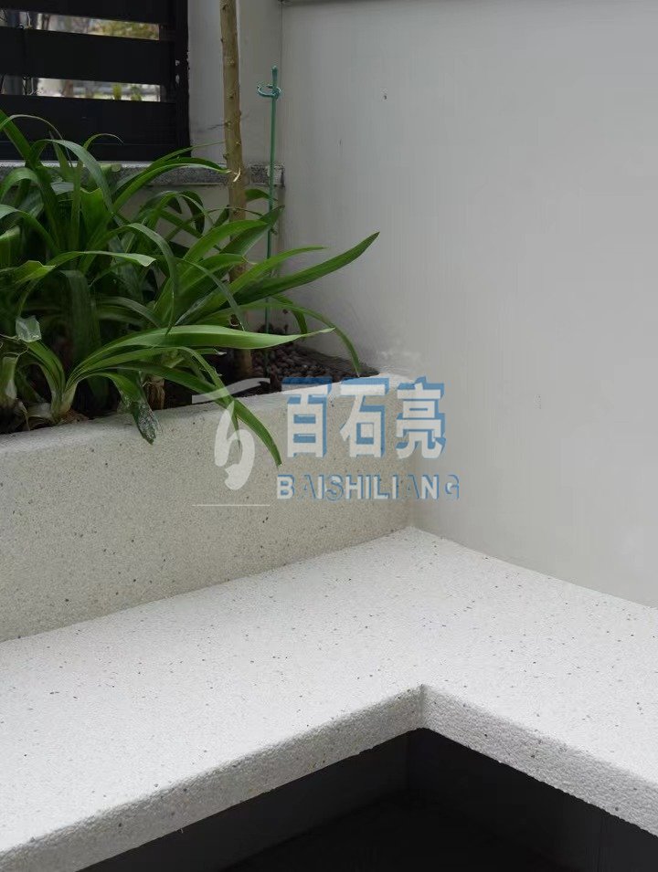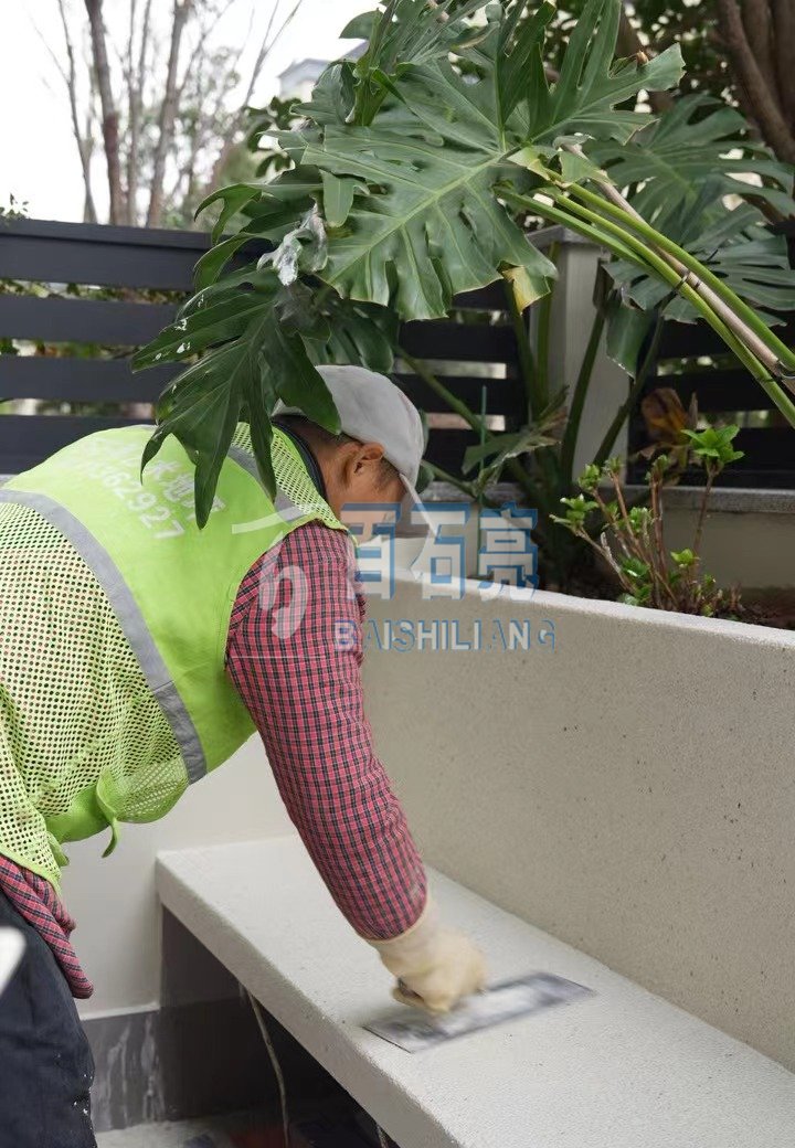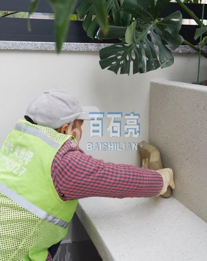 將混合均勻的水洗石骨料與水泥,攤鋪在平面和立面上,厚度大約在1-1.5公分左右。施工的范圍就是花池,坐凳,很多線條感。