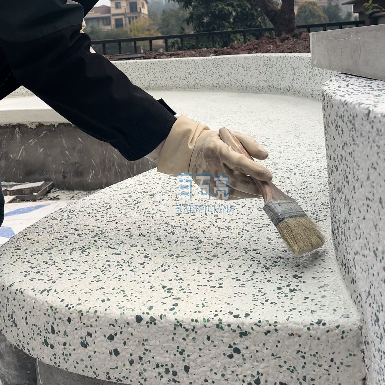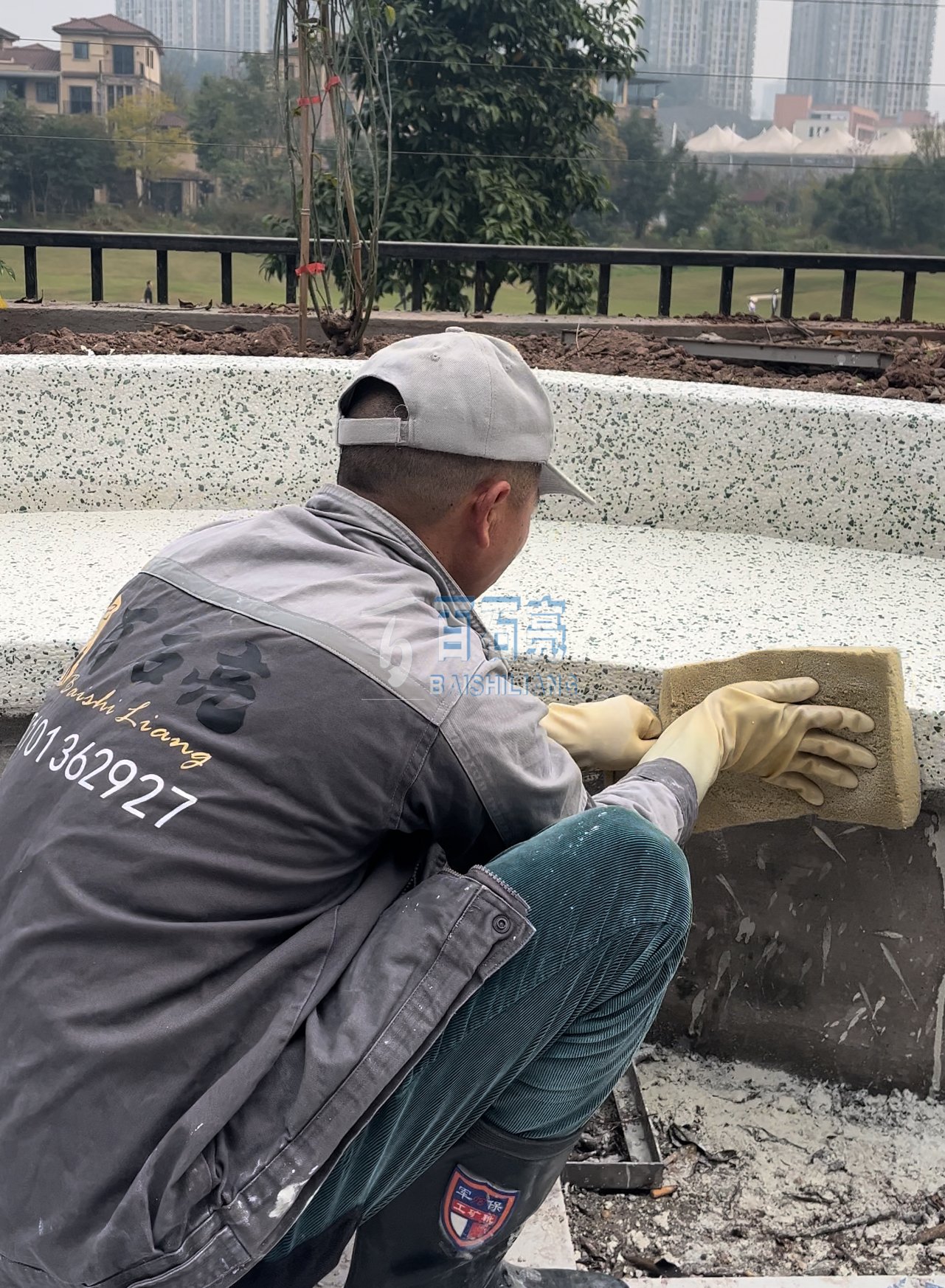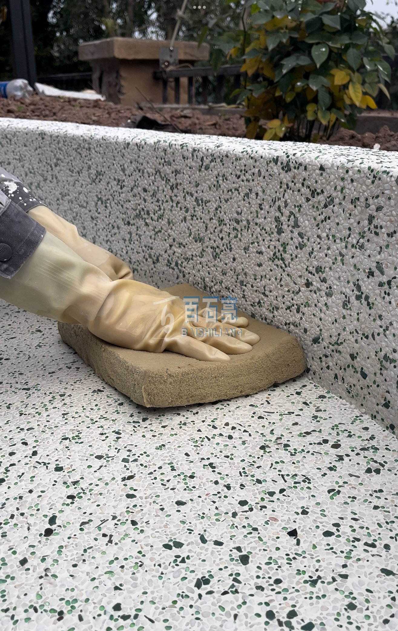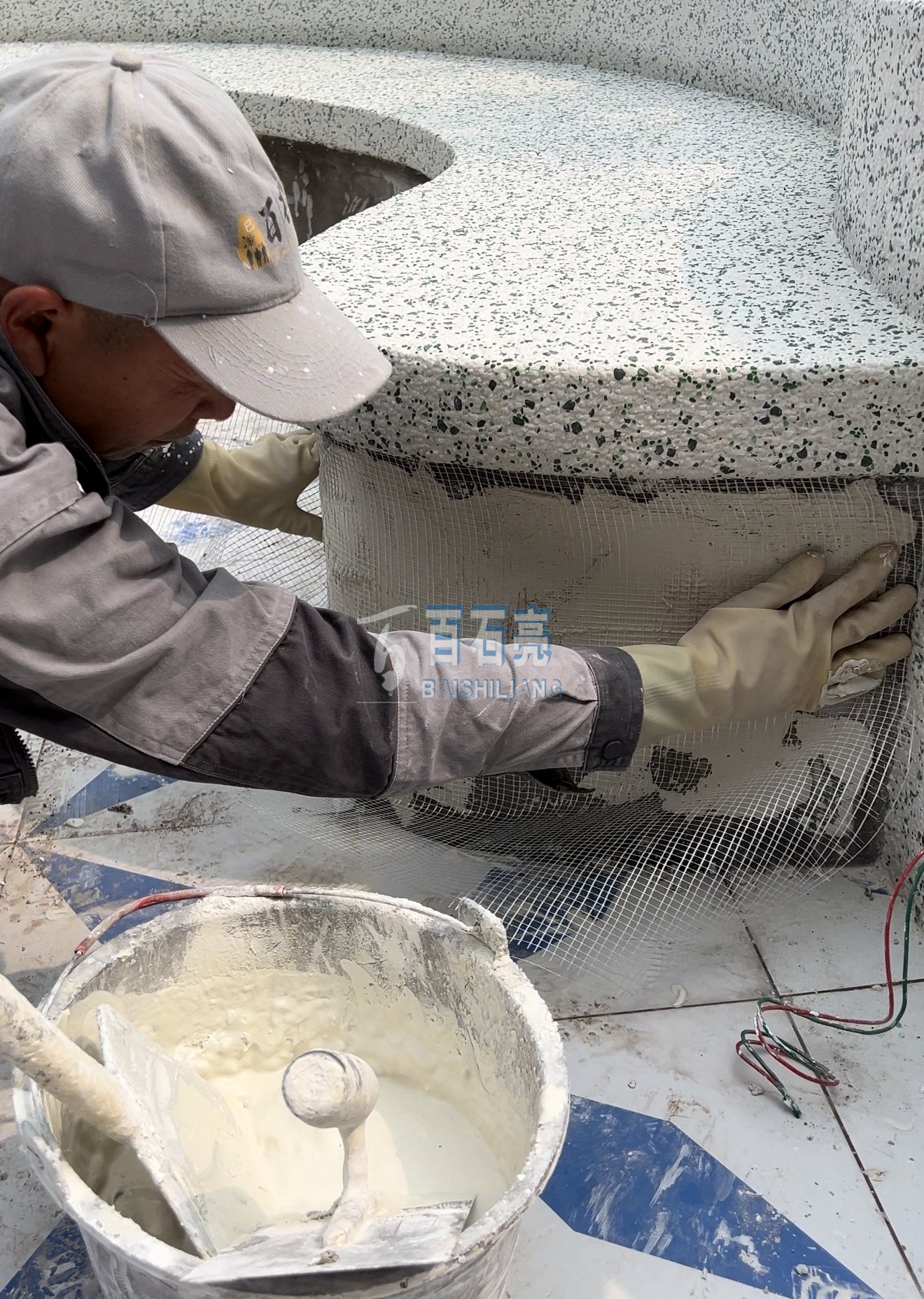 這個異型的坐凳,攤鋪水洗石之前需要刷一層粘接劑,然后再鋪上一層網(wǎng)這樣才能使水洗石長久的粘貼在立面上粘貼得更牢固不易脫落。