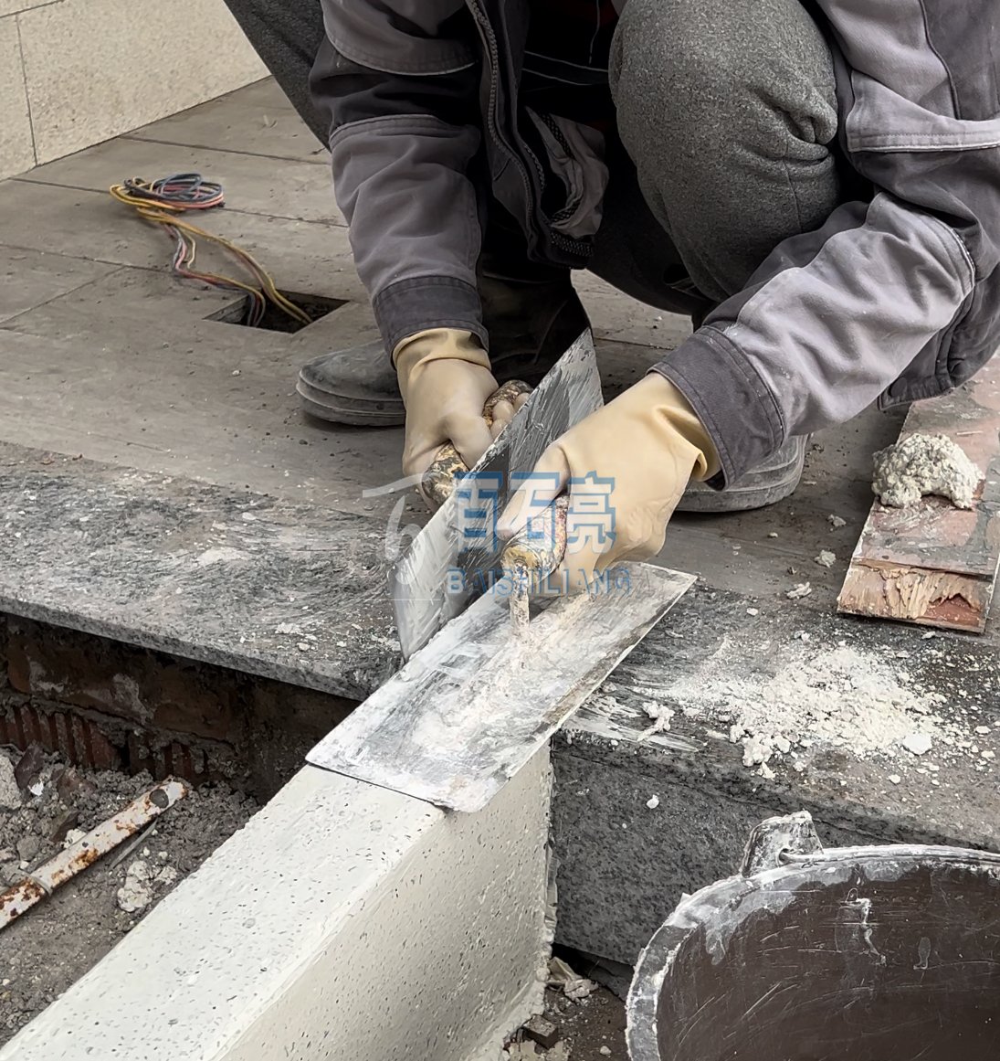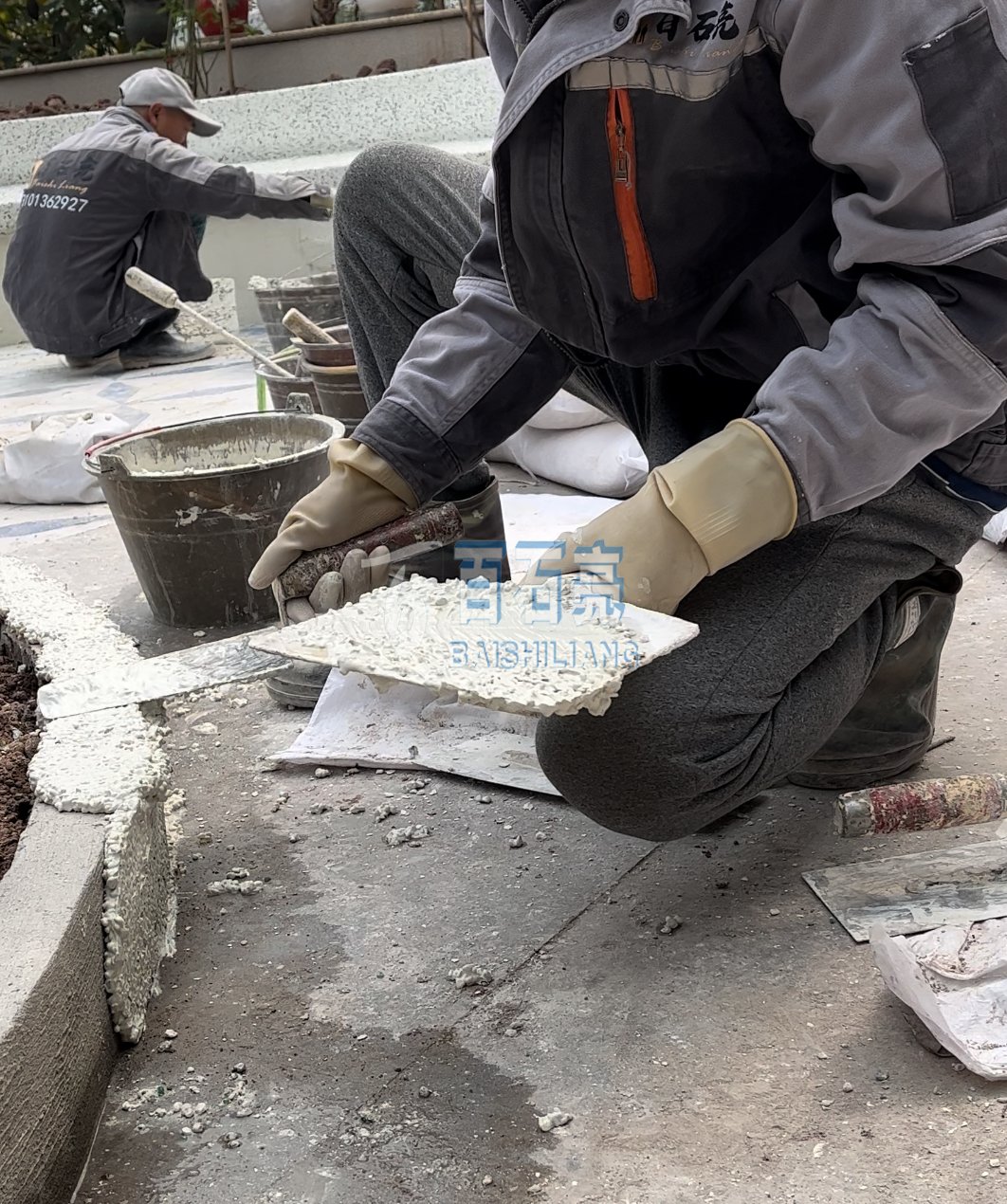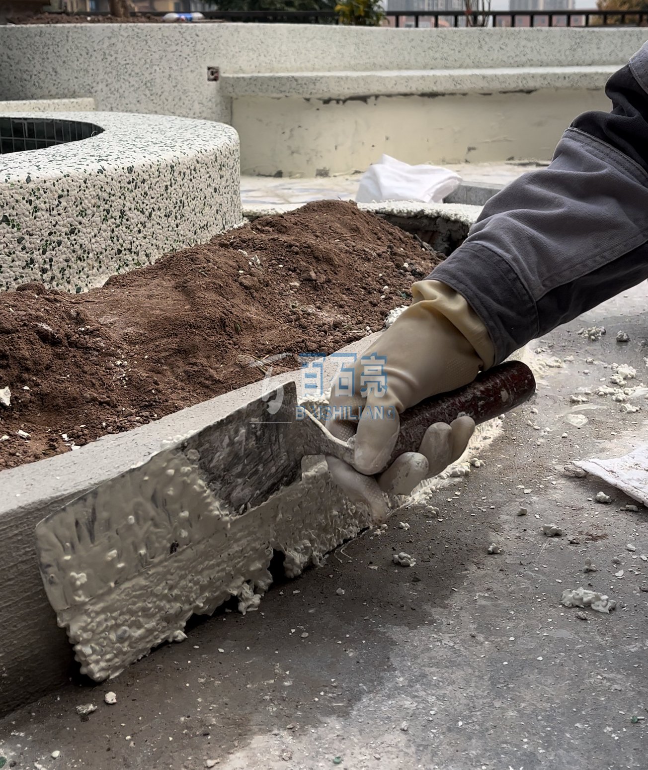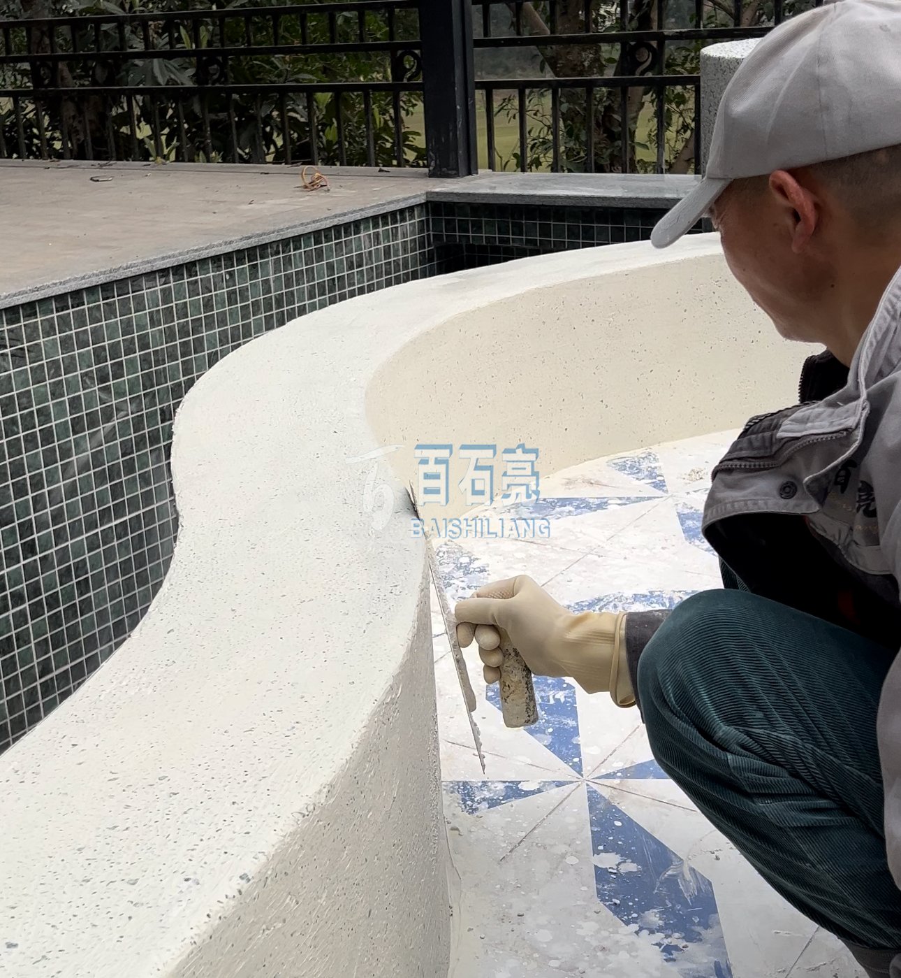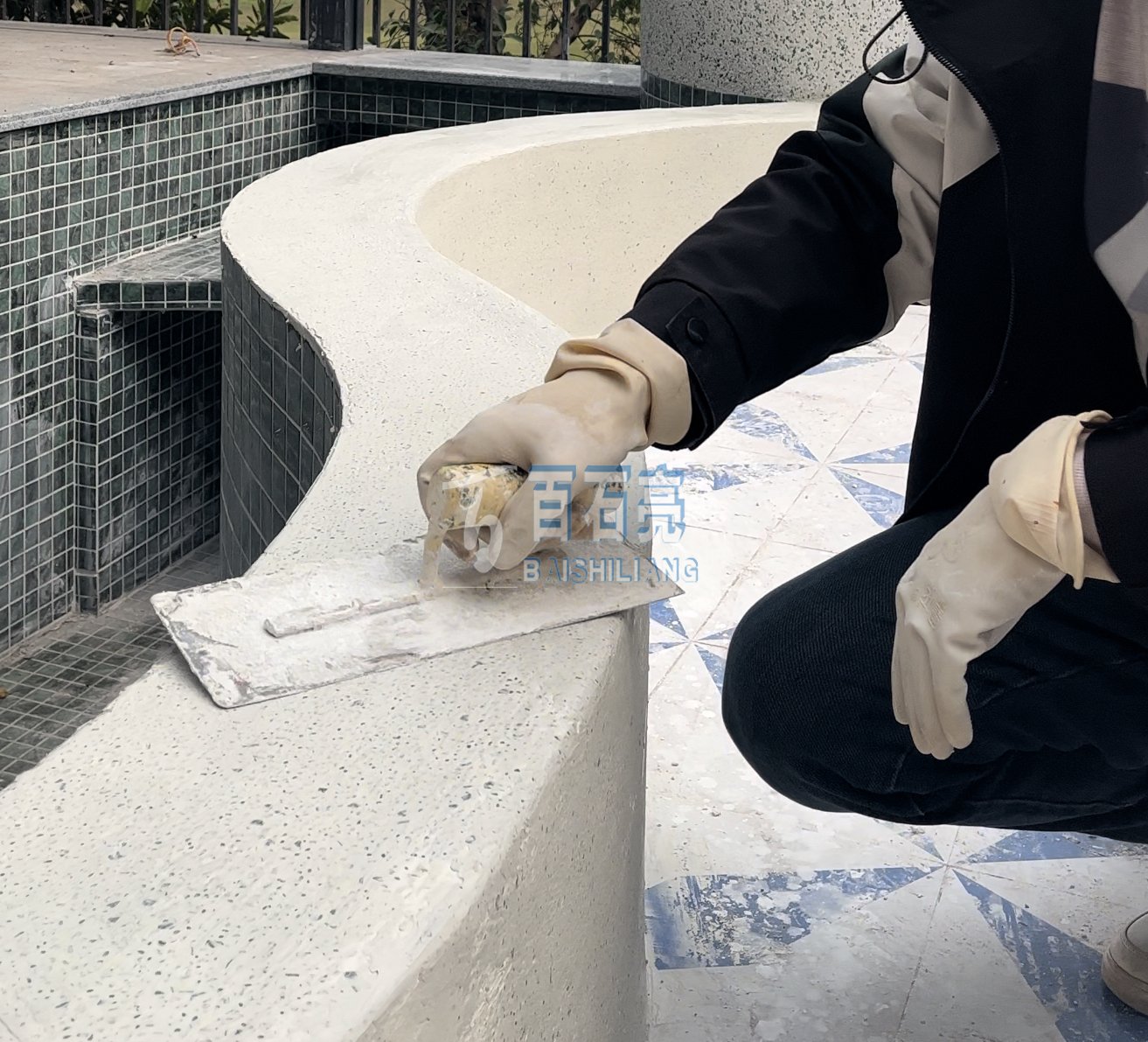 這個異型的坐凳,攤鋪水洗石之前需要刷一層粘接劑,然后再鋪上一層網(wǎng)這樣才能使水洗石長久的粘貼在立面上粘貼得更牢固不易脫落。